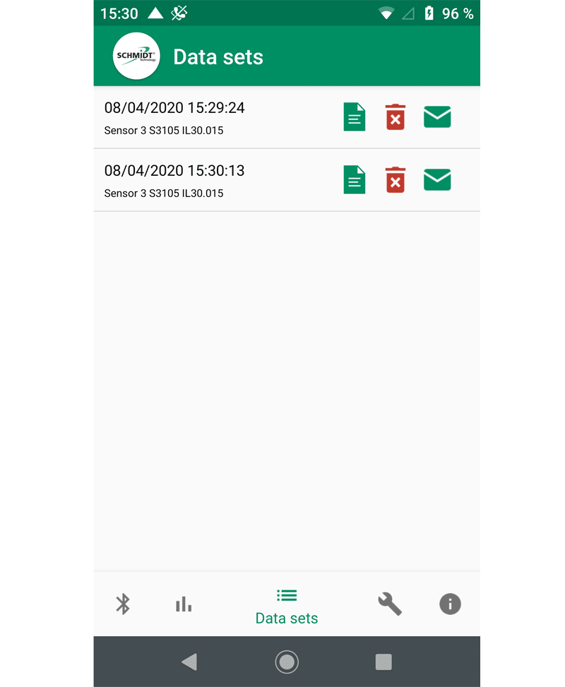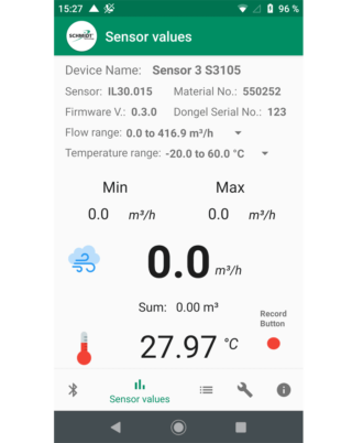 | Additionally required device | Mobile device, e.g. smartphone, tablet System requirements: - Android® version 7.0 or higher - Bluetooth® version LE (4.0) or higher For use of full functionality of the SCHMIDT® Sensor App for Android an active internet connection is required. |