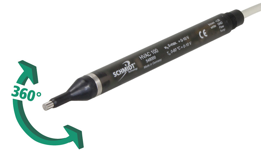Der HVAC 100 ist ein qualitativ hochwertiger Strömungs- und Temperatursensor für saubere Luft und Gase, in einem kompakten und ansprechenden Design, mit einem ausgereiften 360°-Messkopf. Ausgeführt als Kombinationsstabmessfühler wurden im Besonderen die Marktanforderungen der HLK-Branche umgesetzt, um dort einen optimalen Einsatz zu gewährleisten. Durch die speziell entwickelte 360°-Messfähigkeit muss der Sensor nicht aufwendig auf die Strömungsrichtung ausgerichtet werden und ermöglicht so eine ausgesprochen einfache und schnelle Montage. Ein Zweiwege-Montagehalter ist im Lieferumfang enthalten. Die integrierte Zweifarb-Status-LED erleichtert die Inbetriebnahme vor Ort.